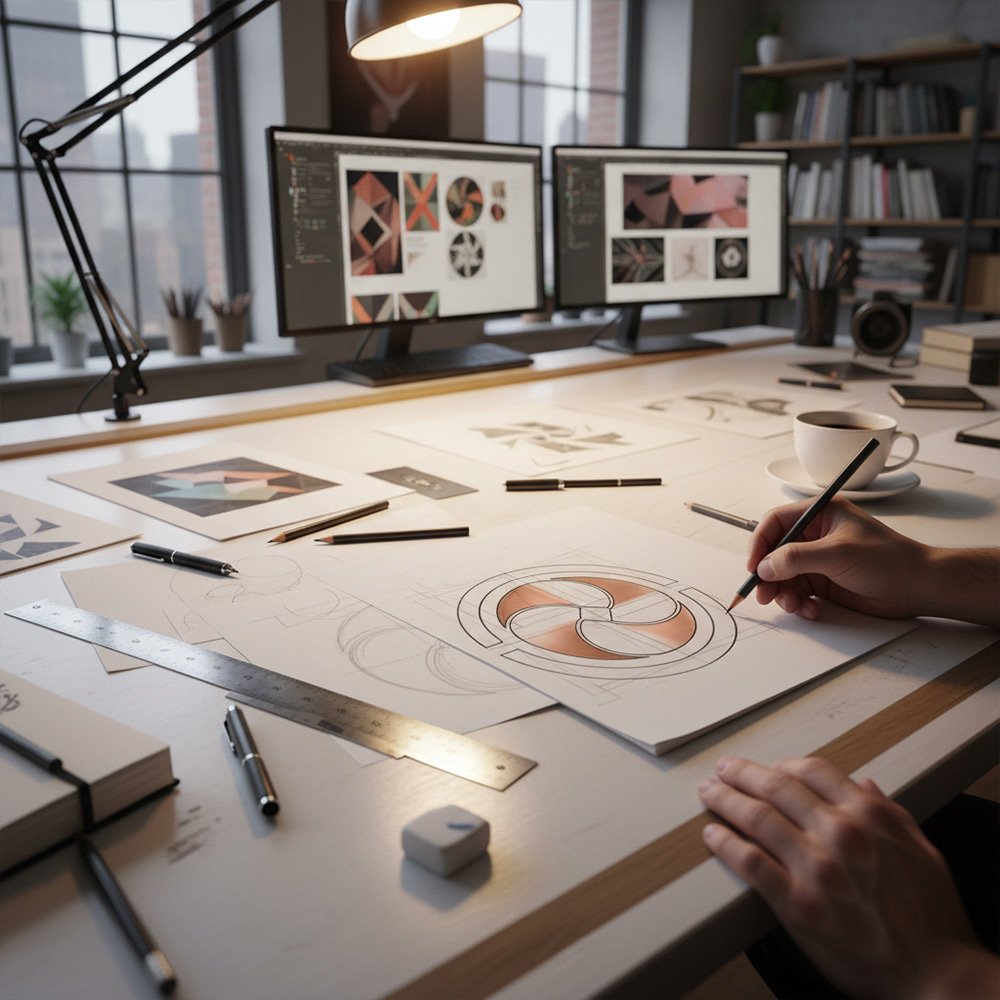 Las referencias al futurismo se incorporaron mediante composiciones geométricas, destellos, gradientes metálicos y un uso cuidadoso del contraste, creando una estética que se siente tecnológica, pero cálida gracias a los cobres y naranjas profundos. El resultado es una marca que comunica visión de futuro, solidez técnica y un carácter claro de dirección creativa.