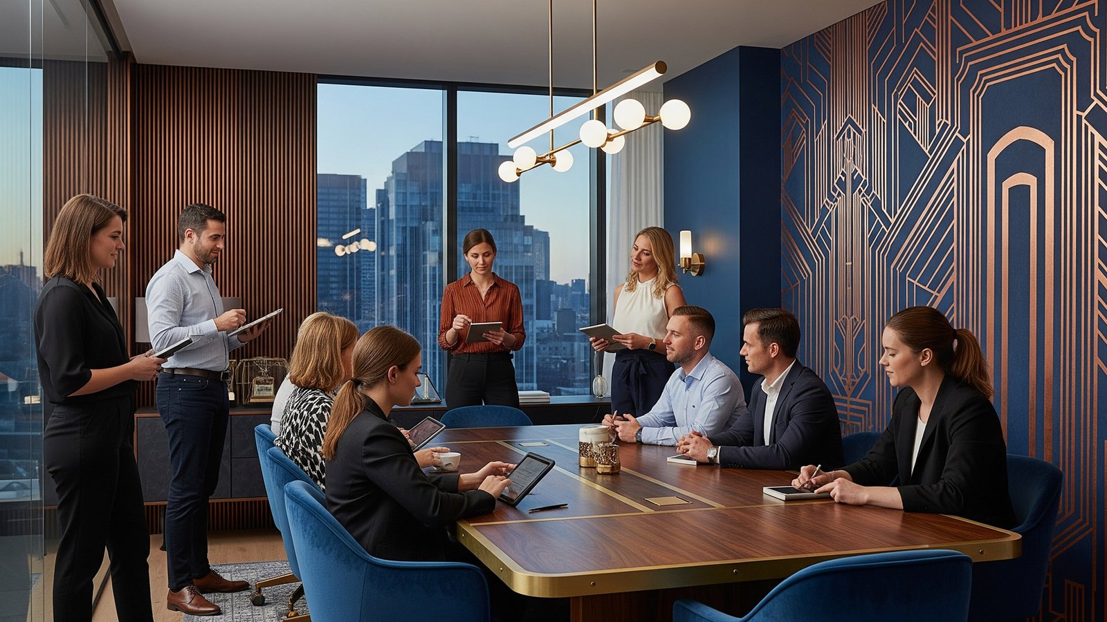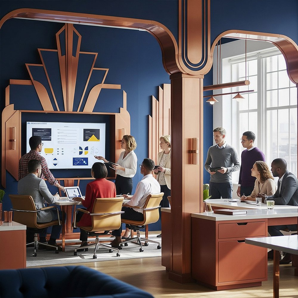 Desarrollé una paleta en la que los tonos cobrizos se convirtieron en protagonistas, combinados con negros profundos y acentos metálicos que remiten a la iluminación de escenarios, sets de filmación y equipamiento técnico. Esta selección cromática permitió evocar una atmósfera de cine art déco mezclada con modernismo, generando una sensación de lujo industrial y tecnología avanzada.